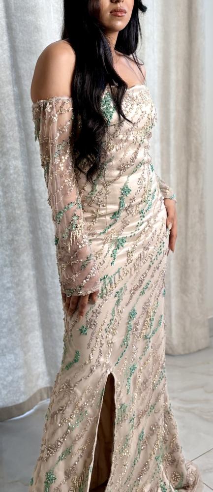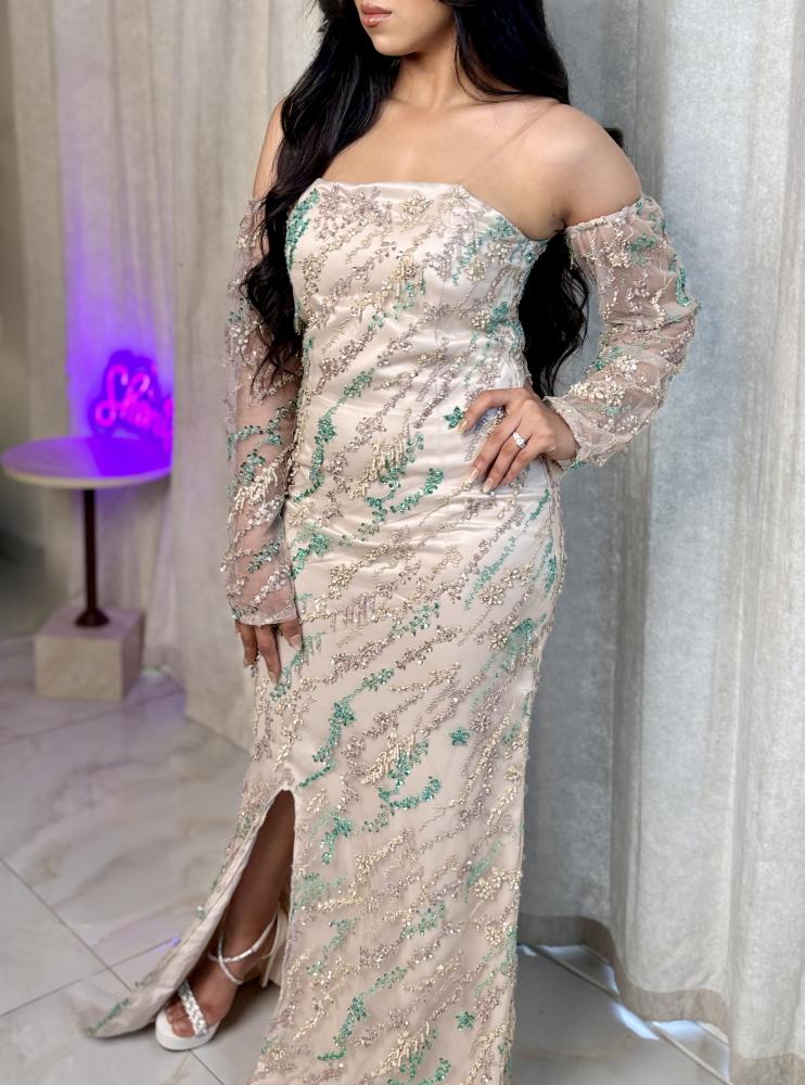 فستان سهرة راقي باللون النيود الفاتح، يفيض بالأنوثة والجاذبية. يتميز بتصميم الأكتاف المنسدلة الشفافة المطرزة بخيوط لامعة وأحجار براقة بالذهبي والأخضر، مما يضفي لمسة فنية متألقة على الإطلالة.